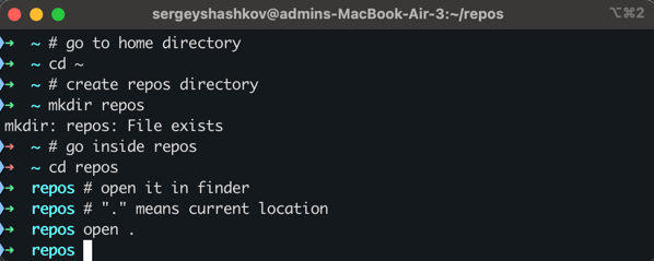 First, let's create a clean place on your computer to keep your code. We will create a folder called repos in your home directory.